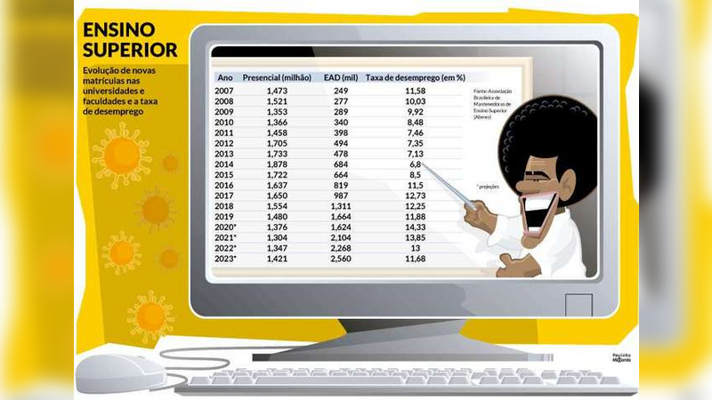 O ensino superior a distância no Brasil ganhou força nos últimos anos e, desde o ano passado, solidificou terreno. O número de novas matrículas na modalidade remota ultrapassou aquelas do presencial, aponta levantamento da Associação Brasileira de Mantenedoras de Ensino Superior (Abmes), em parceria com a empresa de pesquisas educacionais Educa Insights. A representante do setor privado no país aponta o mesmo cenário em Minas Gerais, que, em 2018, último dado disponível, registrou redução de 3,1% na quantidade de alunos que assistem às aulas diante da lousa e aumento de 15,6% no total daqueles que optam por se formar pela tela do computador.