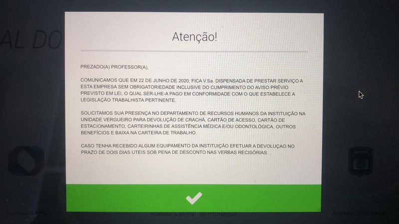 Há uma semana, professores da Universidade Nove de Julho (Uninove) foram surpreendidos com um comunicado de demissão por pop-up, quando tentavam acessar à plataforma de aulas, de acordo com o Sinpro-SP. Neste caso, a associação também entrou com uma ação no TRT. A Uninove não respondeu à reportagem se houve ou não demissão em massa, mas disse que, diante da pandemia, “fomos ao limite para manter nosso quadro funcional”.