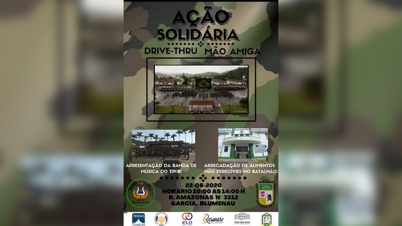 23º Batalhão de Infantaria fará Drive Thru solidário no sábado (22) para apoiar famílias carentes de Blumenal. O evento é uma adaptação do tradicional do Concerto da Banda de Música do Batalhão alusivo à semana do soldado.