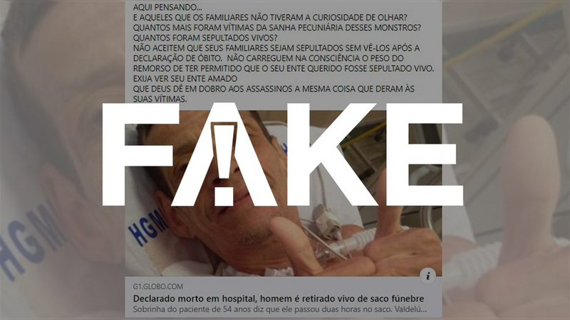 A mensagem falsa aponta os padrões de segurança em sepultamentos de vítimas de Covid-19 como indício da fraude. A mensagem usa o título de uma reportagem para dar veracidade ao boato. Só que o caso utilizado ocorreu muito antes da pandemia atual. O link compartilhado é de uma notícia publicada pelo G1 em agosto de 2014 que conta a história de Valdelúcio de Oliveira, de 54 anos. Ele passou duas horas em um saco fúnebre após ter sofrido duas paradas cardíacas e ter sido declarado morto em um hospital de Lauro de Freitas, região metropolitana de Salvador. O caso levou a uma investigação na época.