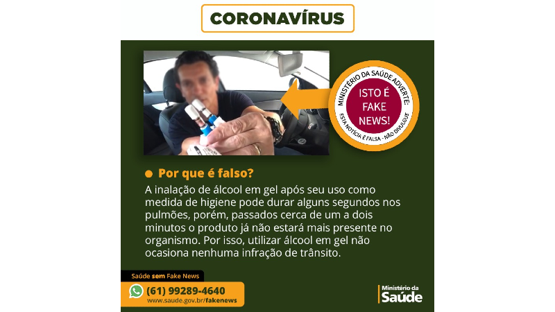 O Ministério da Saúde informa que a utilização do álcool em gel como medida de prevenção às doenças transmissíveis é eficaz e importante para evitar a disseminação de vírus. A inalação momentânea do álcool em gel após sua utilização pode durar alguns segundos nos pulmões, caso esteja em ambiente fechado, com pouca ventilação. Contudo, é eliminado em menos de dois minutos. É importante esclarecer que apenas a inalação do produto não acarreta absorção do álcool na corrente sanguínea como ocorre nos casos das pessoas que ingerem bebidas alcoólicas. Portanto, utilizar álcool em gel não vai ocasionar nenhuma infração de trânsito.