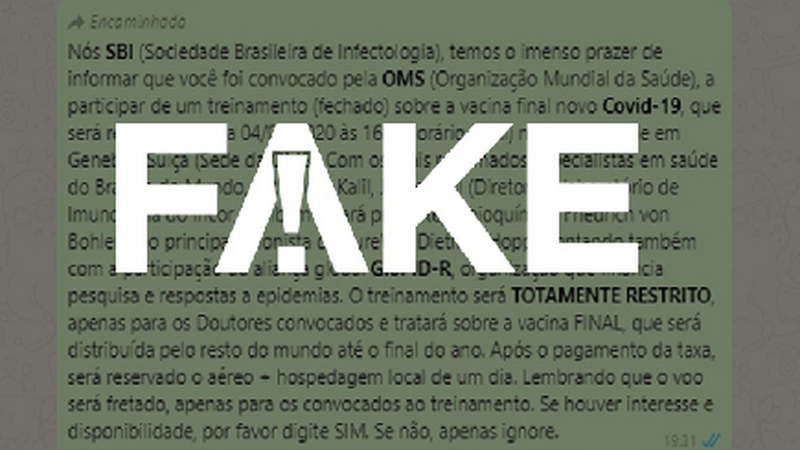 Circula no WhatsApp uma mensagem que fala sobre um convite da Sociedade Brasileira de Infectologia em nome da Organização Mundial da Saúde (OMS) para a participação de um treinamento fechado sobre a vacina final da Covid-19 na Suíça. O texto afirma que o treinamento será totalmente restrito, apenas para os doutores convocados, e focará na vacina que será distribuída pelo resto do mundo até o final do ano. A mensagem diz ainda que “após o pagamento da taxa, será reservado o aéreo + hospedagem local de um dia”. “Lembrando que o voo será fretado, apenas para os convocados ao treinamento”, diz o boato.