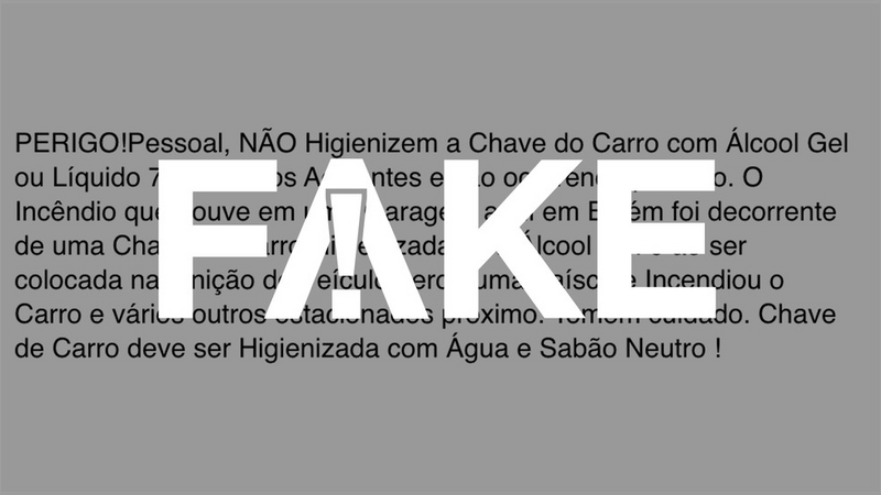 Procurado pela CBN, o Corpo de Bombeiros nega que um carro tenha pegado fogo na garagem de um prédio em Belém (PA) depois do motorista higienizar a chave do veículo com álcool em gel e a colocar na ignição. Segundo a corporação, não há registros que apontem esta circunstância como causa de incêndio veicular no estado nos últimos meses. Houve, de fato, um incêndio, no último dia 2, na garagem de um prédio no bairro Umarizal. Só que Valneci Soares, síndico do edifício, diz que o dono do carro não fez uso de álcool gel nem na chave nem em nenhum outro lugar no veículo. Ele afirma também que o fogo teve início na parte dianteira, onde fica o motor, e não na parte interior, onde está a ignição. À CBN ele afirma que o dono do carro voltou do trabalho no início da noite do dia 1º, desligou o automóvel, desembarcou, acionou o alarme e nada aconteceu. No dia 2, por volta das 5h45, o incêndio teve início. Ou seja, as chamas não começaram quando foi acionada a ignição. Segundo Gerardo Portela, doutor em Gerenciamento de Riscos e Segurança pela COPPE (UFRJ), para que a hipótese da mensagem falsa seja concretizada, é necessário o uso de uma quantidade de álcool suficiente para que se forme a chamada “mistura perfeita” para a queima ou explosão.