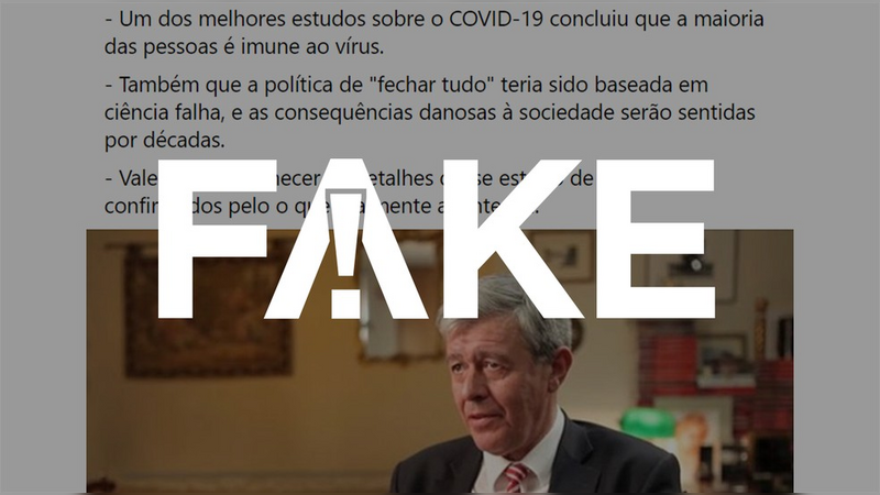 A mensagem falsa tem uma foto de Karl Friston, um conceituado pesquisador da University College London, numa entrevista, e afirma que “um dos melhores estudos sobre a Covid-19 concluiu que a maioria das pessoas é imune ao vírus”, que “a política de fechar tudo foi baseada em ciência falha”, e que “as consequências danosas à sociedade serão sentidas por décadas”. Procurado pela CBN, Friston esclarece que não é autor de uma publicação a este respeito e que não deu essas declarações. “Estão afirmando nas redes sociais que eu disse que ‘80% da população mundial é imune à Covid-19 e que, portanto, o bloqueio era inútil’. Mas isso é falso”, afirma o cientista, que é especialista em modelos computacionais e vem se debruçando sobre os dados da pandemia.