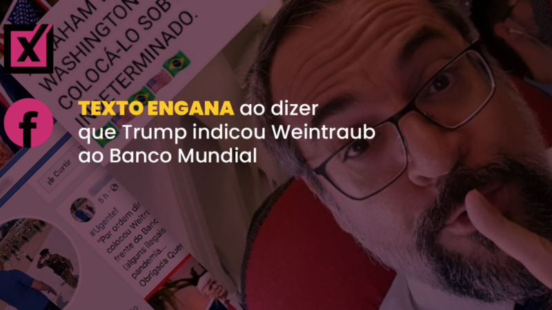 É enganosa a informação que o ex-ministro da Educação, Abraham Weintraub, teria sido nomeado diretor-executivo do Banco Mundial pelo presidente dos Estados Unidos, Donald Trump. O texto induz a acreditar que a nomeação de Weintraub ao cargo já foi aceita e que o mandatário americano teria participação direta no processo. Ainda, fornece informações equivocadas sobre o papel da instituição, como um suposto monitoramento do Conselho de Controle de Atividades Financeiras (COAF) e da Receita Federal.