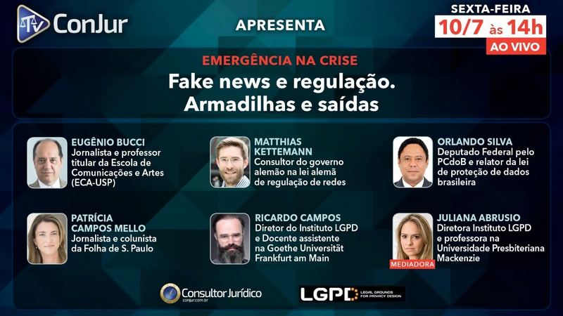 Nesta sexta-feira (10/7), a partir das 14h, na TV ConJur, professores, jornalistas e um consultor do governo alemão para o assunto vão discutir o projeto de lei sobre as notícias falsas ou fraudulentas. O programa tem apoio do Instituto Legal Grounds for Privacy Design (LGPD) e da curadoria do professor Ricardo Campos, professor assistente na Goethe Universität Frankfurt am Main. O evento terá a mediação da advogada Juliana Abrusio.