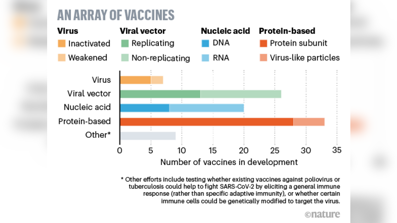 Mais de 90 vacinas estão sendo desenvolvidas contra o SARS-CoV-2 por equipes de pesquisa em empresas e universidades de todo o mundo. Os pesquisadores estão testando diferentes tecnologias, algumas das quais nunca foram usadas em uma vacina licenciada antes. Pelo menos seis grupos já começaram a injetar formulações em voluntários em testes de segurança; outros começaram a testar em animais. O guia gráfico da Nature explica cada design de vacina.