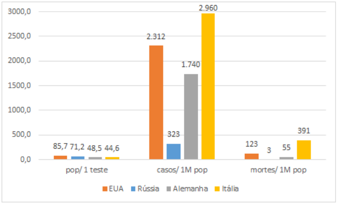 Países com testagem próxima como EUA e Rússia ou Alemanha e Itália apresentam inconsistência no número de casos detectados, sendo os EUA com sete vezes mais casos que a Rússia e a Itália com 1,7 vezes mais que a Alemanha (Gráfico 1). Isso mostra que a testagem tem que vir junto com outras atitudes, como o isolamento e rastreamento por exemplo, pois se estes começarem tardiamente, a doença se espalha e não se consegue rastrear e isolar as pessoas.
