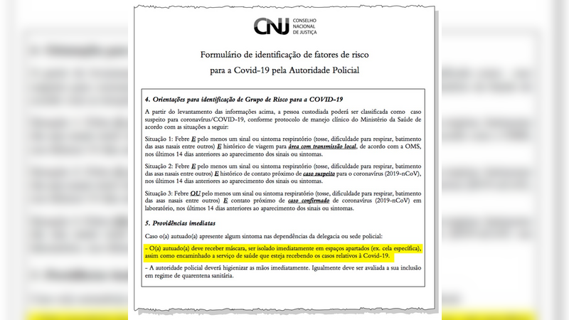 Após recomendação da Justiça, policiais civis (PC) do Rio de Janeiro (RJ) deverão levar presos com suspeita de infecção por Covid-19 para unidades de saúde aptas a receber pacientes com a doença. O ato estabelecendo a mudança foi publicado no boletim interno da corporação na última quinta-feira (21).A medida, comunicada a diretores da PC pelo delegado Fábio Barucke, subsecretário de Planejamento e Integração Operacional, orienta que seja cumprida a recomendação do Grupo de Monitoramento e Fiscalização do Sistema Penitenciário, do Tribunal de Justiça.O texto afirma que “autoridades policiais responsáveis pela lavratura de autos de prisão em flagrante e autos de apreensão observem a obrigatoriedade da instrução do formulário de identificação de fatores de risco para Covid-19”.