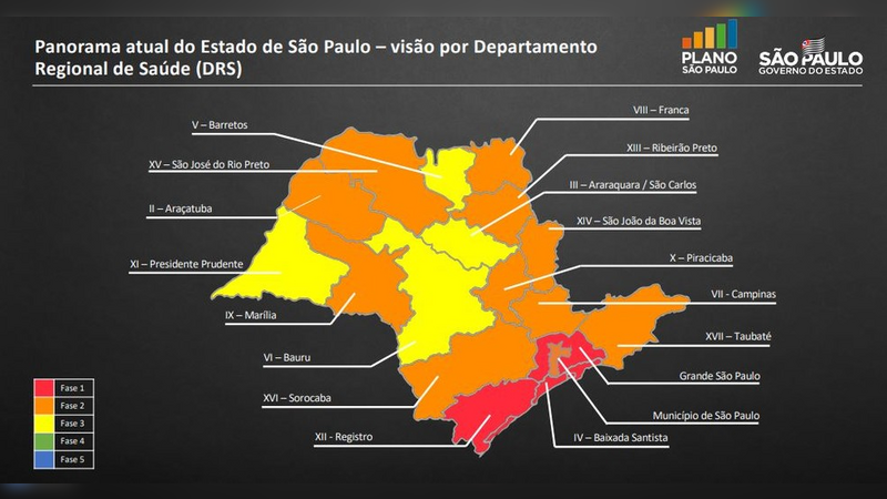 Com base em seus cálculos de projeção da doença no Estado e numa escala que leva em consideração a capacidade do sistema de saúde, o governo de São Paulo (SP) lança, a partir do dia 01/06/20, um plano de relaxamento das medidas de distanciamento social. Sessenta e duas cidades ainda não poderão reabrir o comércio considerado não essencial.